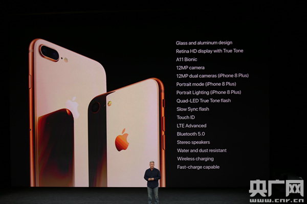 iPhone 8发布:支持无线充电 iPhone 8规格共有4.7英寸和5.5英寸Plus两个版本。机身舍弃了铝合金,改用前后双面玻璃设计,支持防水功能,配色方面,有金色、银色、黑色三种颜色。 硬件方面,iPhone 8搭载了苹果目前最强的A11六核处理器,这次的处理器由苹果自主研发,对于GPU方面进行提升,图像处理提升30%,多任务处理快70%,在游戏体验中有明显提升。 拍照方面,iPhone 8后置1200万像素摄像头,新增“人像光线功能”,可感知周围光线,推荐光线。iPhone 8支持在慢动作摄像上支持1080p分辨率,240帧慢动作。ISP处理器也有提升,iPhone 8在拍照尤其是弱光拍照时,进行优化,噪点更少。 iPhone 8 Plus则后置1200万像素双摄,f1.8光圈+f2.8光圈,比iPhone 7 Plus光圈更大。在人像模式下表现更出色,功能更丰富,支持1080P 240fps的慢动作视频。 用户在拍照时可以选择想要使用的灯光效果,不是过滤器,而是对脸上的光线的实时分析。视频拍摄也很出彩,iPhone 8 在智能手机中拥有最高质量的视频捕捉。 iPhone 8支持AR技术(增强现实功能)。iPhone 8是第一款为增强现实技术开发出的智能手机,配置为增强现实技术提供的标准化摄像头、陀螺仪、新型传感器。 无线充电功能也加入到iPhone 8中。iPhone 8支持Qi无线充电。充电方式和之前安卓机有些类似,将iPhone 8放置到无线充电板上进行充电。目前QI无线充电技术已经在各大酒店和餐饮店支持。无线充电板也加入第三方配件。支持AirPods无线耳机,支持蓝牙5.0。 同时,苹果正式带来全新iPhone X。如之前曝光的完全一样,苹果也采用了一个全面屏,而且是带“额头”的全面屏。