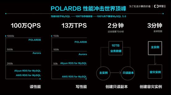 图为POLARDB第三代分布式共享存储架构 在行业还在使用第一代,第二代架构的同时,阿里云已经率先实现第三代架构的产品布局。在存储技术上,创新性加入自研数据引擎POLARSTORE,实现数据流的智慧调度,让POLARDB拥有澎湃的性能动力(6倍性能于MySQL)及完美兼容性(100%向下兼容MySQL 5.6)。 其次,POLARDB还采用软硬一体设计逻辑,最大限度发挥硬件性能,实现领先同行一倍的核心指标:64核CPU及512GB内存,提供最大100TB的存储容量。配合针对高并发场景采用类似Fallocate方式的预先分配日志文件系统和高达50Gbps的RDMA网络,实现支持最高每秒15万次写请求以及50万次读请求,并减少50%的IO消耗。 在实测跑分上,POLARDB读写性能均超越同级产品,读性能实现100万QPS,写性能实现13万TPS,领先同行。