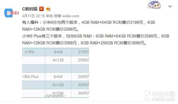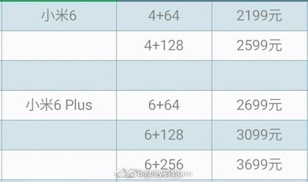 小米6全系价格疑似泄露