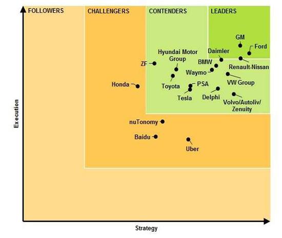 该报告将自动驾驶公司分为引领者、竞争者、挑战者和跟随者四类,处于引领地位的三家公司——福特、通用、戴姆勒——事实上同时也是传统汽车行业的巨头。谷歌母公司的Waymo、特斯拉被归为竞争者一类,而百度和Uber则被放在第三梯队的挑战者中。 这份报告同时也指出,自动驾驶领域的竞争是一场旷日持久的军备竞赛,随着技术的发展和这些企业未来战略的发布,种种因素都会影响排名,很难出现常胜将军,这一领域的企业将呈现动态排名。 |