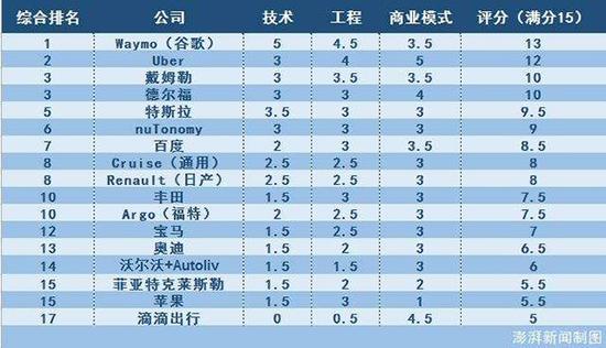 外媒排名自动驾驶技术:谷歌夺冠百度第7苹果倒数 The Information主要从技术、工程、商业模式三个指标对上述公司进行了打分。其中,Waymo是唯一个在技术上获得满分5分的公司,并且与第二名的3分拉开了较大距离,这意味着Waymo在技术上已经具有了较大的领先优势。同时,仅有Waymo与Uber在工程这一项中获得4分及以上的分数。 The Information分析认为,目前在无人驾驶的关键领域,像Waymo和Uber这样的科技公司已经建立了显著优势,将传统车企甩在身后。 Uber则是唯一一个在商业模式上获得满分的公司,被称为中国版Uber的滴滴出行也在该项中获得了4.5分。 目前业界普遍认为,在未来无人驾驶与共享出行的结合将带来较大的商业机会。而在此次上榜的公司中,大多数均在共享出行或乘车服务方面有所布局,譬如通用汽车拥有Maven并获得了Lyft的大量股权,宝马拥有DriveNow,戴姆勒拥有Car2Go等。 这份榜单也对两家中国公司进行了评价——百度以总分8.5分排名第七,在三项指标的打分中均表现平平。目前,自动驾驶在百度内部被提升到了较高的战略地位。该公司在今年4月提出了“阿波罗计划”,将把自动驾驶软件向全行业开源。 另一家中国公司是滴滴出行,但它在17家公司中名列最末,尤其在技术上获得了唯一的零分。不过,这或与滴滴在部署无人驾驶上起步较晚有关,该公司已经在加大对该领域的投入。据悉,滴滴出行目前聘请了Uber的自动驾驶项目的著名安全工程师查理·米勒(Charlie Miller),并且挖来了Waymo专门从事对象检测的工程师。 令人吃惊的是,科技巨头苹果公司却在这份名单中成了“吊车尾”——总分5.5,与菲亚特克莱斯勒并列15名。苹果公司是较早布局无人驾驶的科技公司之一,在两年前公司就启动了专门的无人车项目“Project Titan”,并为之成立了专门的部门。但可惜的是,该项目进展相当缓慢,并于去年裁撤了专门的汽车部门。外媒消息称,苹果或将放弃独立造车的计划,转而与成熟的汽车厂商合作开发。 综合来看,The Information的这份调研结果显示,在较高级别的自动驾驶领域,传统汽车制造商并不具备优势,这与此前另一家机构的排名有较大出入。 今年4月,市场调研机构Navigant Research公布的全球自动驾驶全球实力排名显示,传统车厂获得了压倒性的优势,福特汽车排名第一,紧随其后的是通用,前五名当中的另外三家分别为雷诺日产联盟、戴姆勒和大众。大众眼中的明星公司谷歌仅排第7位,而同为科技公司的Uber和百度甚至没能进入前十。 Navigant Research 的报告总共探讨了18家领先公司开发自动驾驶系统的策略和执行情况,目的是对全球自动驾驶系统市场的相对优势和劣势进行客观评估。其中包含10个评判标准,分别为:视力;市场策略;伙伴;生产策略;技术;销售;营销和分销;产品能力;产品质量可靠;产品介绍;持续活力。