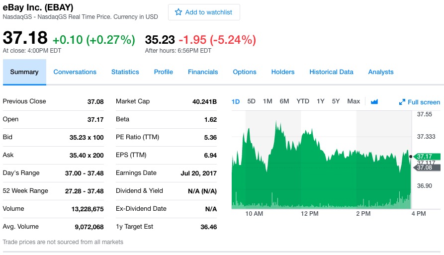 eBay股价 eBay周四在纳斯达克交易所的开盘价为37.17美元。截至周四收盘,eBay股价上涨0.10美元,报收于37.18美元,涨幅为0.27%。截至美国东部时间周四18:56分(北京时间周五6:56分),eBay股价在盘后交易中下跌1.95美元至35.23美元,跌幅为5.24%。过去52周,eBay股价最高为37.48美元,最低为27.28美元。(编译/箫雨) |