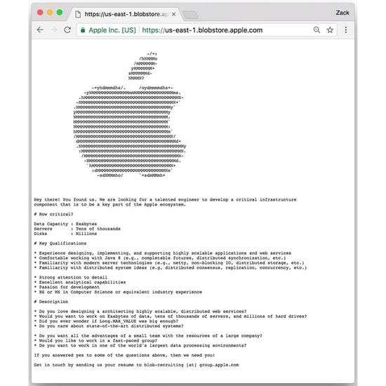 新浪科技讯 北京时间8月21日早间消息,苹果网站利用一个隐藏的页面招募一名从事“关键基础设施组件”的工程师。 该页面的网址是us-east-1.blobstore.apple.com,目前已经失效。之前的内容显示,这个组件涉及EB级的数据、数以万计的服务器和数百万磁盘。他们希望应聘者能够设计和部署可扩展的应用和网络服务,还要熟悉Java 8、现代服务器和分布式系统。 虽然经验丰富的工程师未必很难找到这个页面,但其不同寻常的位置或许还是可以从一定程度上确保应聘者的水平。 目前还不清楚苹果何时关闭的这个页面,或者此举是否意味着他们已经招募到合适的人选。该公司要求应聘者将简历发送到“blob-recruiting [at] group.apple.com”。 现在还无法判断苹果所指的云服务具体是什么。考虑到该公司的全球化触角,iCloud、iTunes、App Store、Apple Music都有可能达到EB级。(书聿) |