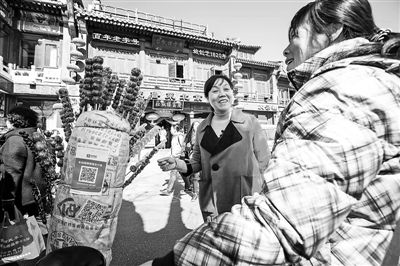 第三站:北京最老街道,95%以上的店铺都用无现金支付。骑上共享单车,虞纯来到北京城最老的一条胡同——烟袋斜街。几乎所有的店铺都能用无现金支付了。漂亮的窗花、可爱的兔儿爷,都可以扫一扫就拿走。连卖糖葫芦的都用上了支付宝收款。据了解到,目前这条街上的近百家商铺里,可无现金交易商户占比95%以上。