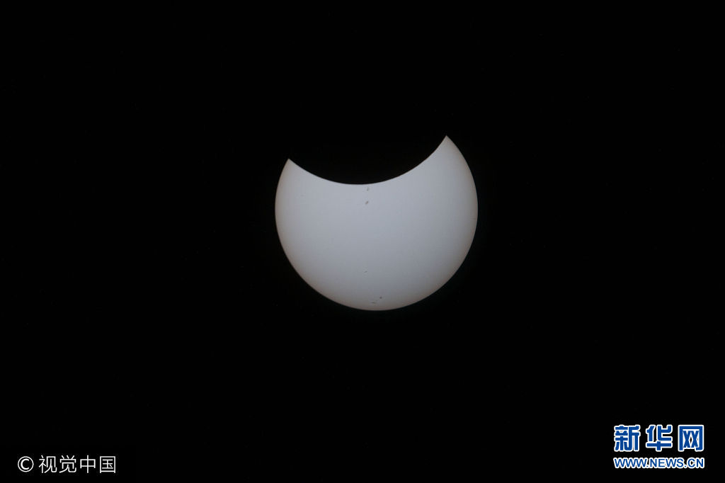 当地时间2017年8月21日,从国际空间站拍摄的日食景象。当天美国迎来罕见日食景观,此次日食在地球表面形成宽约113公里的日全食带,自西北向东南贯穿美国本土,美国14个州可观测到日全食。(图片来源:视觉中国)