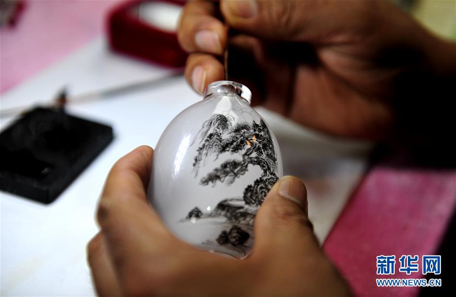 8月23日,天津市工艺美术大师王新年在展示鼻烟壶画技艺。当日,2017上海民族民俗民间文化博览会在上海图书馆拉开帷幕。本次博览会致力于弘扬“工匠精神”,将中国传统文化与现代生活相结合。新华社记者 张建松 摄