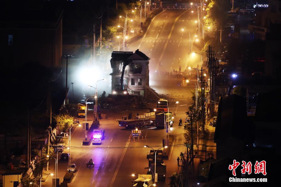 9月18日凌晨,随着两台挖掘机的开动,位于上海松江区沪亭北路的“路中屋”终于在占道14年后被和平拆迁。拆除后,这条南北四车道的马路将恢复通畅。中新社记者 张亨伟 摄