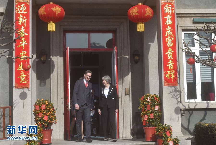 2月1日,英国首相特蕾莎·梅在北京出席在英国驻华大使官邸举办的文化招待会。这是特蕾莎·梅欣赏舞狮表演。 新华社记者 金良快 摄