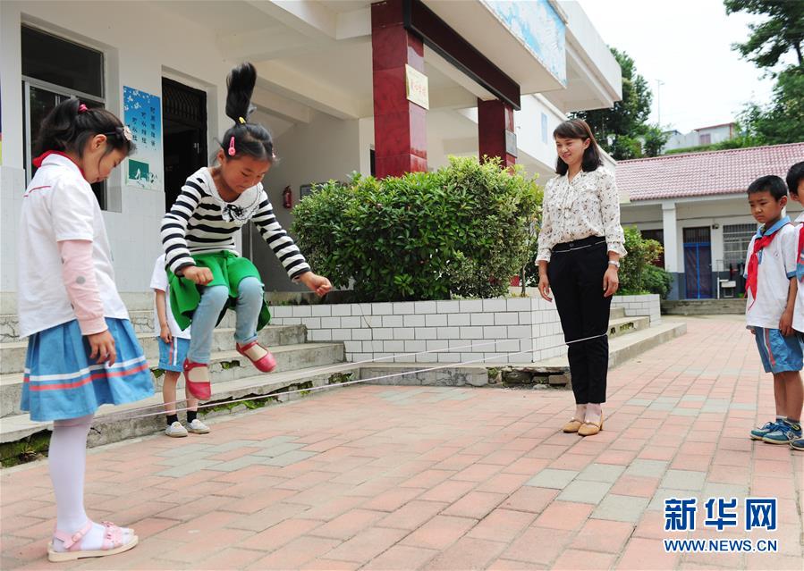 5月29日,苏明娟和金寨县先瑞红军小学的孩子一起玩跳皮筋。当日,“大眼睛”苏明娟带着自己所在单位中国工商银行安徽省分行的捐赠,来到母校金寨三合实验学校和金寨县先瑞红军小学,看望那里的学生们,并给他们送上六一节的礼物和祝福。 1991年,一年级的苏明娟在学校读书的画面被摄影师拍下,成为希望工程的宣传照,如今当年的照片还悬挂在校园里。 新华社发(王从启 摄)