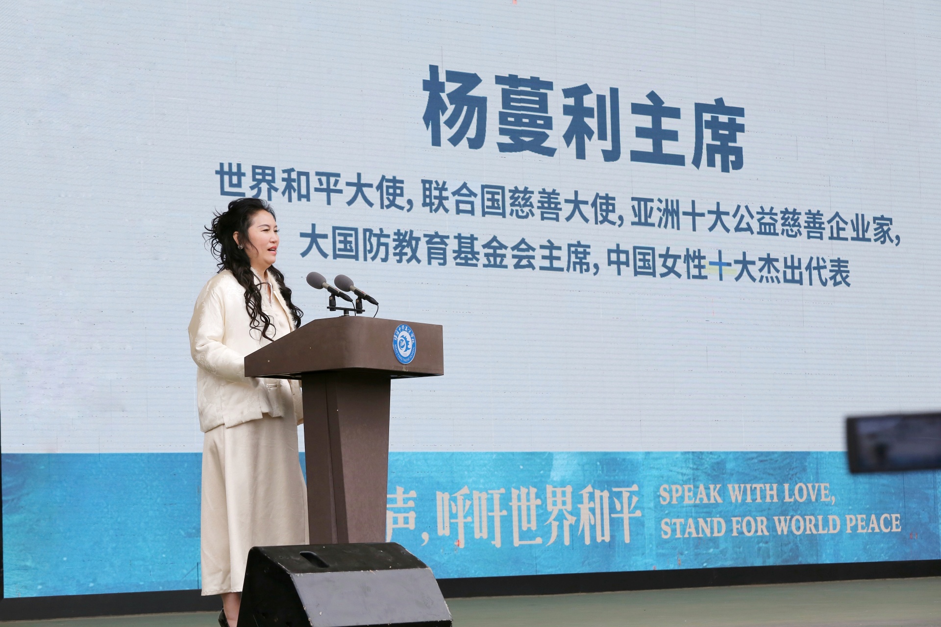 3月18日上午,四川省绵阳中学英才学校举行“为爱发声·呼吁世界和平”主题活动。世界和平大使杨蔓利,绵阳市委编办副主任宋波,绵阳中学英才学校党委书记、理事长任天彪,党委副书记、校长谭昌伦以及新闻媒体代表、师生及家长代表共同参加此次活动。