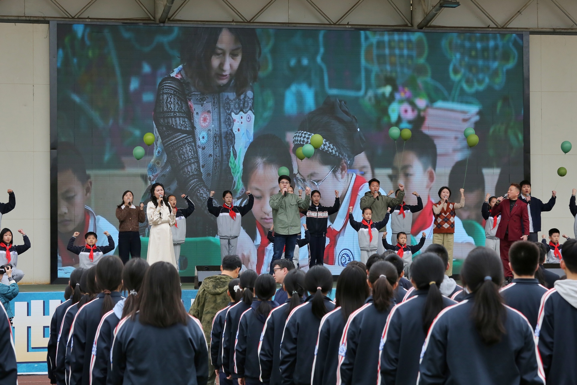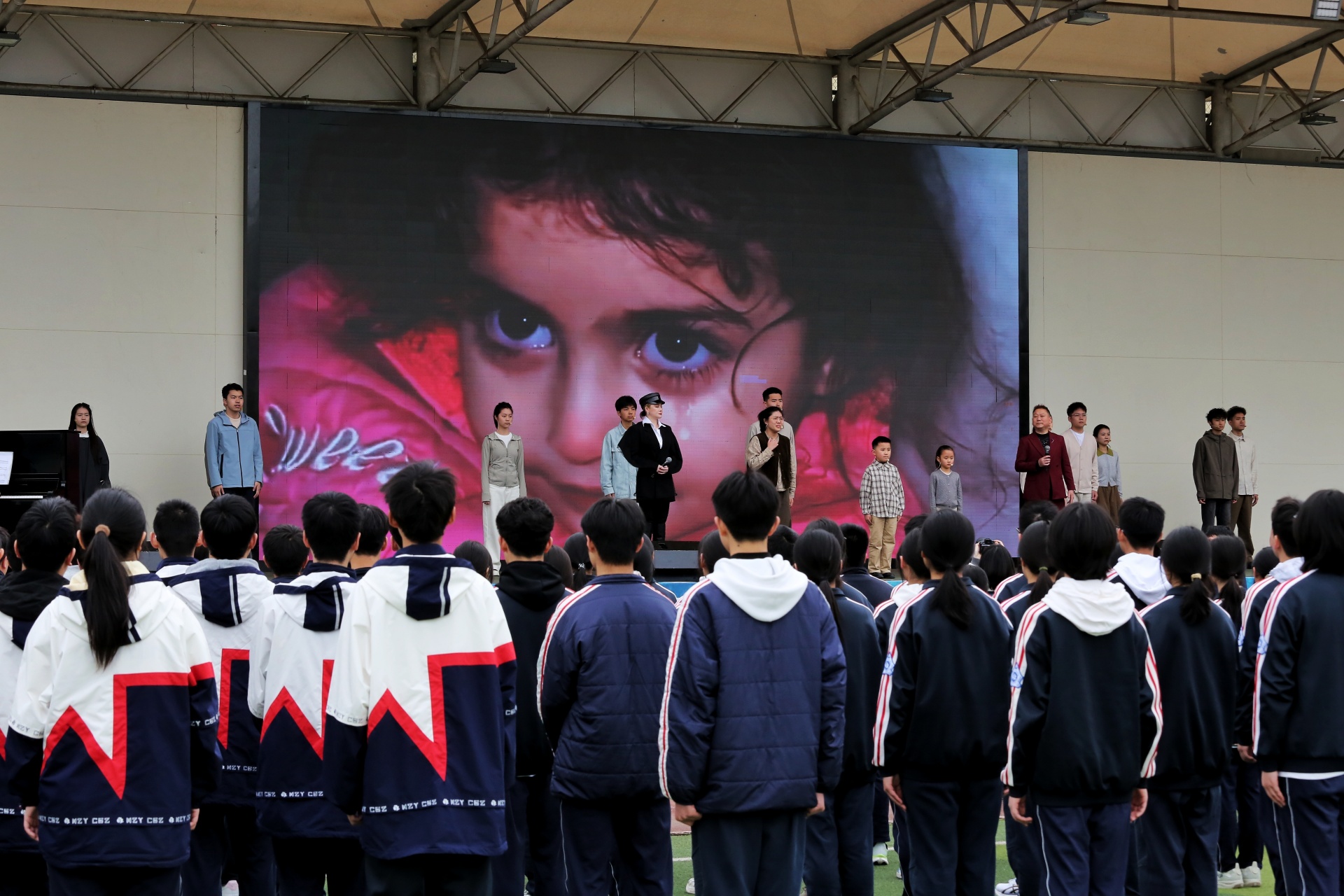 随后,王迪演唱《就恋这片热土》,抒发家国情怀。杨蔓利、王迪与师生共同演绎《感恩的心》,表达对和平生活的感恩之情。