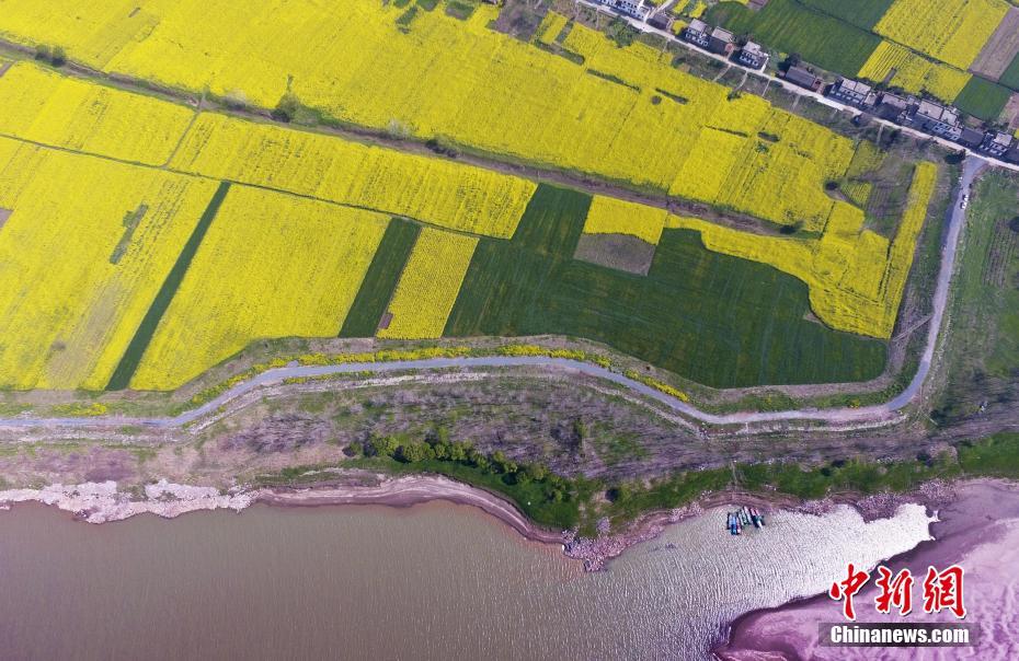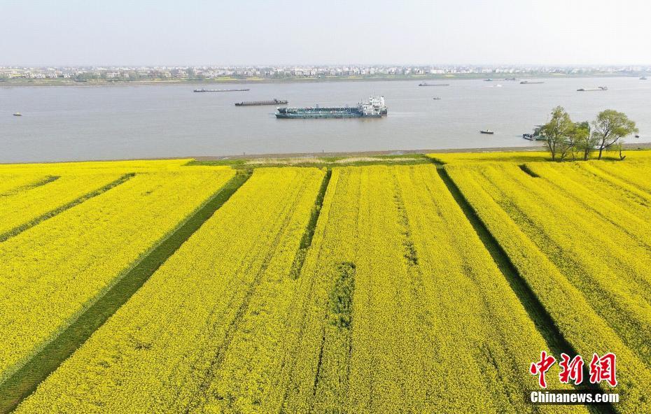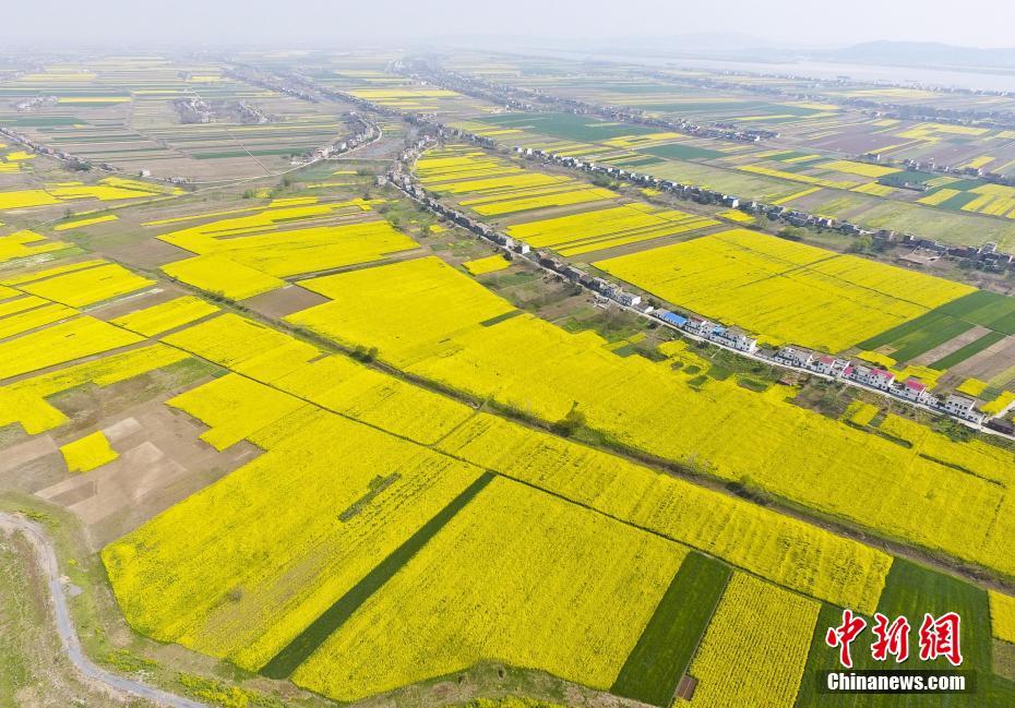 3月14日,航拍江西九江县江洲镇盛开的万亩油菜花海,许多游客慕名而来。三月江洲,春意盎然,万物复苏,遍地竞相盛开金灿灿的的油菜花海与千亩沙滩构成一幅唯美自然画卷。杨风胜 摄