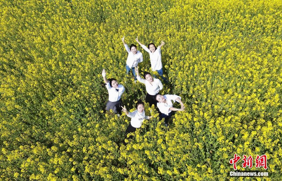 3月14日,航拍江西九江县江洲镇盛开的万亩油菜花海,许多游客慕名而来。三月江洲,春意盎然,万物复苏,遍地竞相盛开金灿灿的的油菜花海与千亩沙滩构成一幅唯美自然画卷。图为许多游客慕名而来。杨风胜 摄