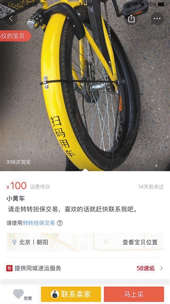 二手物品交易平台上出现共享单车售卖。地点位于北京。