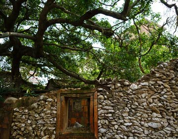 蟳埔村另一大特色是散落在村里的蚝壳房。穿行于弯弯曲曲的巷道,宛若步入迷宫,在一栋栋小洋楼中间,散落着一种独具特色的民居:蚵壳厝。闽南话中,蚵就是海蛎,厝乃房屋之意,蚵壳厝就是“海蛎壳做的房子”。