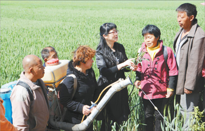 4月23日,在安徽省亳州市谯城区淝河镇凡桥村的麦田里,植保专家(右三)正在向贫困户讲解小麦病虫害的防治技术。