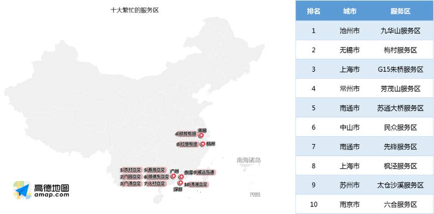 服务区方面,预计“五一”期间最繁忙的服务区包括安徽九华山服务区、梅村服务区、G15朱桥服务区、芳茂山服务区、苏通大桥服务区、民众服务区、先锋服务区、枫泾服务区、太仓沙溪服务区、六合服务区。