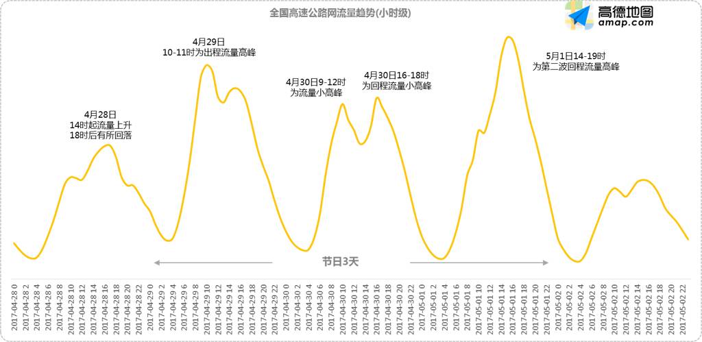 另外,4月30日,也就是小长假的第二日,高速流量呈现两波高峰走势,上午高峰时段为9时至12时;下午高峰时段为16时-18时,5月2日后流量趋于平稳。
