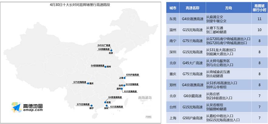 4月30日长时间易拥堵缓行高速路段有 G4京港澳高速(东莞段)、G15沈海高速(温州段)、G75兰海高速(南宁段)等;