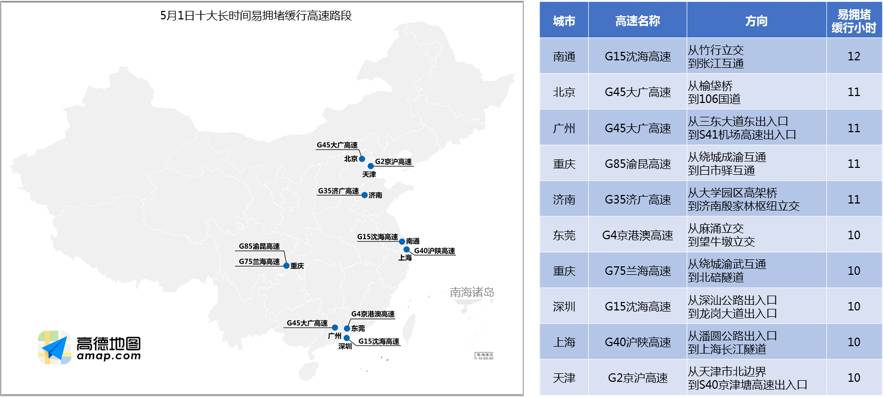 大数据对“五一”假期期间全国高速十大易拥堵缓行路段进行了预测。