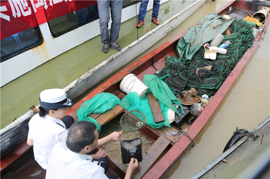 执法人员将所查获违规渔船上的渔获物放归闽江