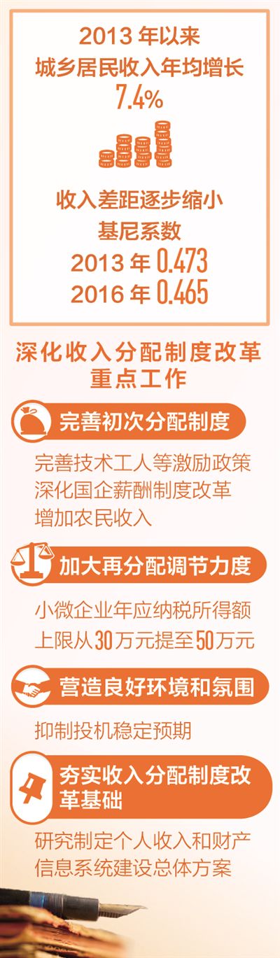 制图:沈亦伶 在国家发改委15日召开的新闻发布会上,新闻发言人孟玮表示,我国将通过开展城乡居民增收综合配套政策试点、专项激励计划试点和收入监测试点三类试点,树立标杆,提炼可复制、可推广的经验做法,完善初次分配制度。同时,针对技能人才、科研人员、企业经营管理者、新型职业农民等多个群体,一是提高技能人才待遇,健全“大国工匠”培养、选拔和激励机制;二是实行以增加知识价值为导向的分配政策;三是改革国有企业工资决定机制,开展中央企业职业经理人薪酬制度改革试点;四是积极支持新型农业主体建设高标准农田,全面推进新型职业农民培育。 2013年以来,我国城乡居民收入稳步增长,年平均增长7.4%。但是,收入增长动能仍需增强,收入分配调节体系还需进一步完善、收入分配公平性有待提高、评估监测机制也要进一步健全。 为落实中央深化收入分配制度配套改革决策部署,加大改革力度,国家发改委会同21个深化收入分配制度改革部际联席会议成员单位,制定出台了《2017年深化收入分配制度改革重点工作安排》,明确了4方面19项重点工作。 一是完善初次分配制度。重点是组织开展城乡居民增收综合配套政策试点,完善技术工人激励政策,实行以增加知识价值为导向的分配政策,完善机关事业单位工作人员激励制度,深化国有企业薪酬制度和混合所有制改革,增加农民收入,加大财产性收入开源清障力度。 二是加大再分配调节力度。重点是推进所得税制改革,扩大享受企业所得税优惠的小型微利企业范围,将小型微利企业的年应纳税所得额上限从30万元提高至50万元。 三是营造良好环境和氛围。重点是强化教育机会公平,保障就业机会公平,抑制投机稳定预期。 四是夯实收入分配制度改革基础。充分发挥深化收入分配制度改革部际联席会议的统筹协调作用,完善收入分配统计与核算,做好支付结算管理工作,建立收入分配政策评估体系以及研究制定个人收入和财产信息系统建设总体方案。 国家发改委目前正同有关部门着力拓宽政策调节覆盖面,重点扩大三个范围,加强两个衔接。 “三个范围”包括扩大享受企业所得税优惠的小型微利企业范围;扩大失业保险制度覆盖范围;探索将支出型贫困家庭纳入救助范围。 “两个衔接”是加强医疗救助与基本医疗保险、大病保险、慈善救助的有效衔接;加强农村最低生活保障制度与扶贫开发政策的有效衔接。 我国还将着力完善深化收入分配制度改革的配套支持体系。一是加快住户调查应用系统建设步伐,完善国民总收入核算方法,及时监测中等收入群体规模变化;二是做好推行银行代发工资的基础性工作,规范和推广非现金支付工具应用;三是引入微观模拟模型,建立收入分配政策评估机制;四是制定出台个人收入和财产信息系统建设总体方案。(记者 陆娅楠) |
