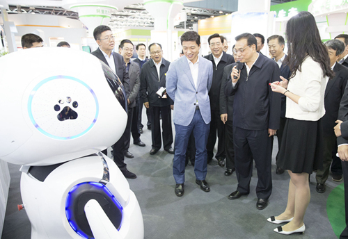 其后的2015年全国双创周上,李克强与百度公司自主研发的机器人“小度”来了场“亲密接触”。“你为什么叫小度?”“百度造的呀!”“你储存了多少数据?”“太多了!”“今天PM2.5值是?”机器人正在“思考”,总理接着问道“你知道双创也利于改善环境吗?”“当然啦!”