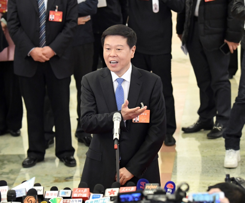 3月12日,十二届全国人大五次会议在北京人民大会堂举行第三次全体会议。这是国家税务总局局长王军接受采访。新华社记者 赵颖全 摄