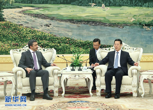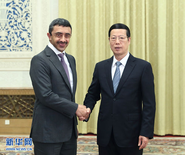 新华社北京5月2日电(记者侯丽军)中共中央政治局常委、国务院副总理张高丽2日在人民大会堂会见阿联酋外交与国际合作部长阿卜杜拉。 张高丽表示,中方从战略高度和长远角度看待中阿关系。成立中阿政府间合作委员会,是落实习近平主席与穆罕默德王储关于发展中阿关系共识的重大举措,双方要充分发挥这一机制对双边合作的统筹规划和协调推动作用。中方愿同阿方共同打造面向未来的战略伙伴关系,用共建“一带一路”来统领中阿友好合作的发展,使两国政治互信更加牢靠,战略合作更富活力,人员往来更为便利,贸易往来更加畅通。 阿卜杜拉表示,阿中关系得到两国领导人和人民的支持拥护,对双边各领域合作产生积极推动作用。阿方钦佩中方的巨大发展成就,愿推动两国关系不断向前发展。