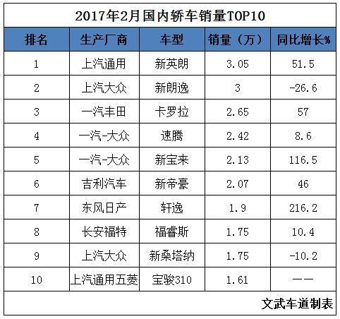 数据来源乘联会 图:盖世汽车销量查询数据库 对比1月份轿车销量数据,大众朗逸1月份销量52428辆,但是2月销量未能保持1月的增长趋势,当月销量仅3万多辆,同比下降26.6%。座次也有1月份的销量冠军推举第二。别克新英朗2月销量3.05万辆,同比上涨51.5%,2016年10月份后再次夺得冠军宝座。