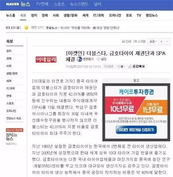 据韩国媒体报道:双星会保证在成为锦湖轮胎的最大股东之后,依然确保锦湖轮胎的独立经营。两者将在战略层面相互合作,在品牌、销售等领域实现共赢,扩大在世界轮胎业界的的影响力。