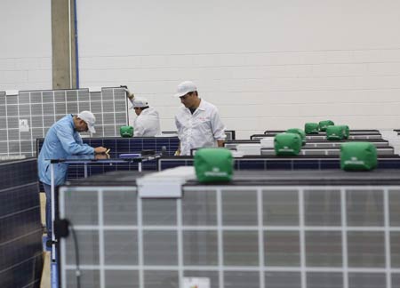 4月6日,工人在巴西坎皮纳斯市的比亚迪工厂生产太阳能板。
