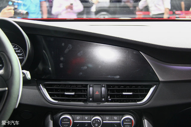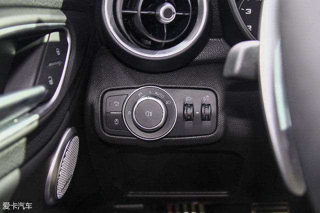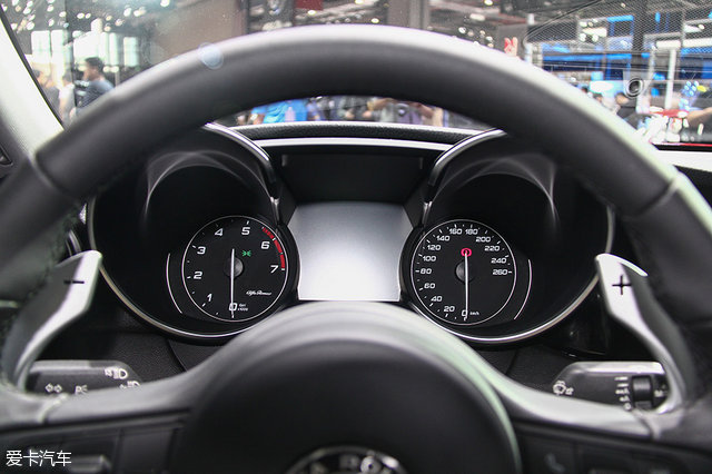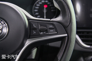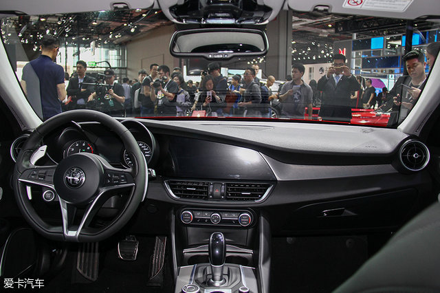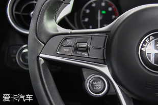 三辐式方向盘设计同样简洁清爽,最吸引人的地方莫过于中心位置的黑白配色Alfa Romeo徽标以及左下方的一键启动按钮。出色的握感很容易带给人浓厚的驾驶欲望。