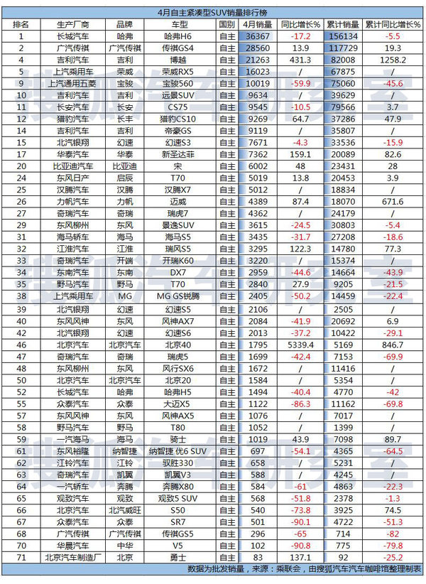 2017年4月,国内SUV市场销量环比下跌13.3%,进入2017年以来,这已经是第三次出现环比下滑。就连备受追捧的紧凑型SUV市场也出现了哈弗H6、CR-V、宝骏560等多款热销车型大幅下跌的局势。SUV高歌猛进的神话似乎正走向破灭。 从4月紧凑型SUV销量前十榜单来看,自主品牌占据6席,与3月持平,较2月占7席略逊一筹。以具体排位情况分析,与3月相比,4月自主品牌曾占据第6、9名下滑至第9、10。这微妙的排位波动透露出一丝讯息,在自主品牌优势很大的紧凑SUV领域,合资车企正悄然赶上。
