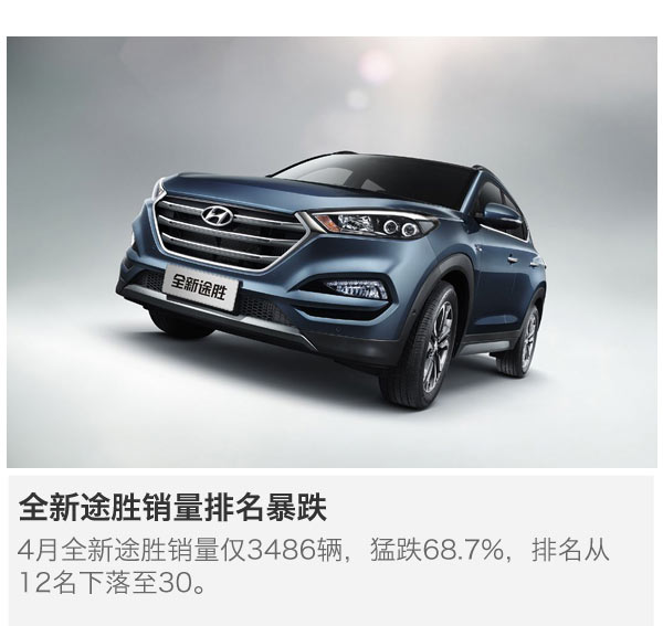 与日系车整体表现向好不同的是,以全新途胜、ix35为代表的韩系车全面溃败,昔日热销车型纷纷遭遇大幅暴跌,令人唏嘘。4月全新途胜销量仅3486辆,猛跌68.7%,排名从12名下落至30。ix35更为惨淡,4月勉强突破千辆,同比下滑82.4%,排名56位。当然,韩系车的遭遇与政治因素大有关系,自从萨德事件爆发,各种抵制韩货的呼声越喊越高,本就已经在中国市场面临边缘化的韩系车彻底沦陷。