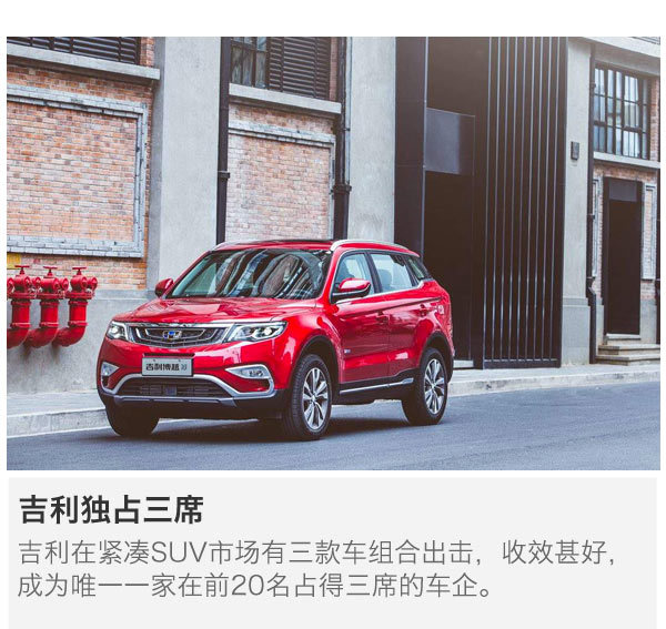 除博越外,吉利在紧凑SUV领域另有两款产品表现也很不错,分别为远景和帝豪GS,这两款车在4月榜单中分列10、14位。吉利在紧凑SUV市场有三款车组合出击,收效甚好,成为唯一一家在前20名占得三席的车企。