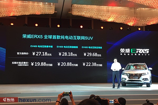 和讯汽车2017年6月3日讯,上汽荣威旗下首款纯电动SUV“ERX5”正式上市,根据配置不同推出三款车型,在享受国家补贴以及地方补贴后,其终端售价为19.88-22.38万元。新车将定位于紧凑型纯电动SUV,目前市场中仅有几款车型可与之竞争。