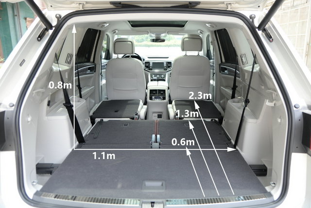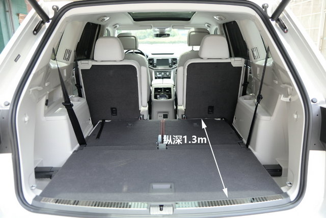 放倒后面两排座椅后,可以形成非常夸张的“载物空间”,最大纵深为2.3m,官方公布的容积数据为2415L。大!太大了! 之前我们已经对途昂380TSI和530V6进行了详细的试驾和测试,外观和内饰部分在此就不再详细介绍了,我们再来简单回顾一下新车的亮点吧。