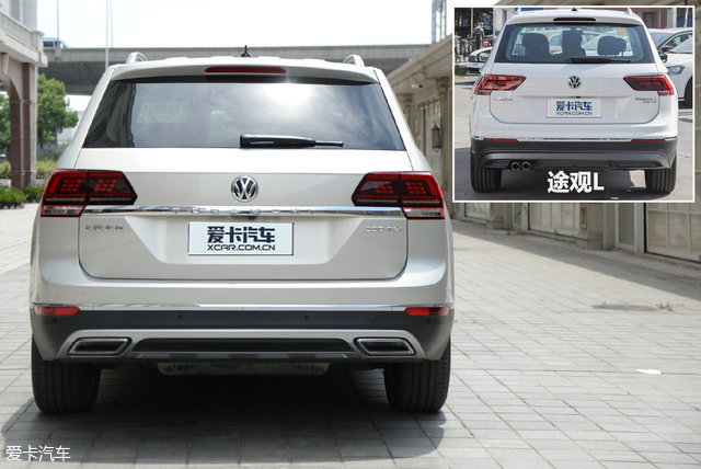车尾的设计与车头呼应,横向拉长的设计手法被再次利用,一根长长的镀铬装饰条贯穿车尾,并融入两侧的尾灯。从造型上看,更像是放大版的途观L。
