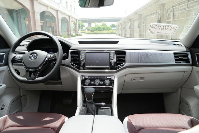 中控台依然是浓浓的大众味,空调面板、MIB多媒体系统、方向盘等,与其他大众车型一致。由于尺寸大,所以空调出风口被重新设计了,加大了尺寸。