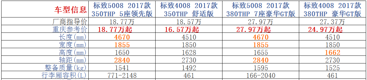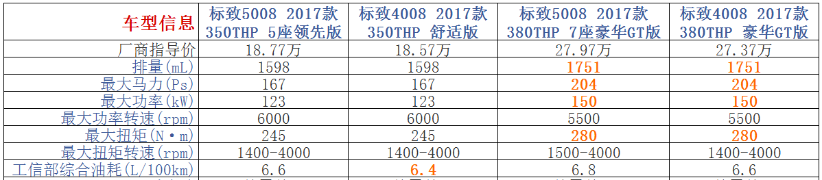 除尺寸其余一样的标致5008和4008如何差异化? 标致5008和标致4008的定价让人看不懂,不仅两款车尺寸相当,动力总成之发动机和变速器也是一样,都是搭载1.6T和1.8T发动机,以及全系标配6AT变速器,发动机的参数都一样,当然底盘也一样。并且,两款车的油耗都是那么接近,唯一的差别就是标致5008没有备胎,而标致4008还有备胎。