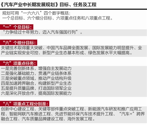 加码智能驾驶 中国目前拥有全世界最大的汽车市场,工信部等三部委公布的《汽车产业中长期发展规划》提出力争经过十年持续努力,迈入世界汽车强国行列。而不得不说,智能汽车是其中最大产业机会之一。智能驾驶在技术的突破、技术的产品化以及大众的接受程度等方面,都大幅超市场预期。各国政府也在纷纷推出相关支持政策占领这个制高点。中国也提出将以新能源汽车和智能网联汽车为突破口,引领产业转型升级,进而可能实现“弯道超车”。企业层面上,不管是科技巨头苹果、腾讯、百度,还是传统车企,在今年以来的投入都有加码的趋势。随着技术的更新迭代,智能驾驶时代正在到来。 苗圩透露,国家智能网联汽车创新中心以及汽车领域的多个省级创新中心也在紧锣密鼓的筹备当中。 工信部等三部委4月25日公布了《汽车产业中长期发展规划》(下称规划),提出力争经过十年持续努力,迈入世界汽车强国行列。 规划提出,到2020年,中国将打造若干家世界知名汽车品牌,若干家超过1000亿规模的汽车零部件企业集团,培育形成若干家进入世界前十的新能源汽车企业,汽车后市场及服务业在价值链中的比例达到45%以上;到2025年,中国将培育若干家产销量进入世界前十强的汽车品牌企业,培育若干家进入全球前十的汽车零部件企业集团。 中国将以新能源汽车和智能网联汽车为突破口,引领产业转型升级,进而可能实现“弯道超车”。同时,汽车产业的边界正在渐趋模糊,随着汽车消费趋势、制造过程、商业模式的变革,整个汽车产业生态正在重塑之中。 2025年若干中国车企抢占前十 工信部部长苗圩表示,“力争经过十年努力,迈入世界汽车强国行列”这一总目标是规划的核心,该规划预测,2020年中国汽车产量将达到3000万辆左右,2025年将达到3500万辆左右。 苗圩表示,2016年,中国汽车产销已突破2800万辆,连续8年位居全球第一,其中中国品牌汽车超过1400万辆。然而,中国汽车产业大而不强的问题依然突出,这主要体现在关键核心技术掌握不足,产业链条存在短板,国际品牌建设滞缓等方面,也是规划需要解决的主要问题。 “中国汽车发展到今天已具有一定基础和条件:中国品牌汽车市场地位不断提高,占有半壁江山,总规模位列世界第四。建设汽车强国一直是中国汽车产业的梦想,也是规划的制高点。”中国汽车工业协会常务副会长董扬向21世纪经济报道记者表示。 工信部装备工业司一位负责人指出,核心技术、企业品牌、国际市场份额等是汽车强国的基本要素,规划对应提出了关键技术取得重大突破、中国汽车品牌全面发展、国际发展能力明显提升三个目标。 技术方面,未来十年中国将在动力系统、高效传动系统、汽车电子等方面达到国际先进水平,动力电池、驱动电机等关键核心技术将处于国际领先水平。同时,要突破车用传感器、车载芯片等先进汽车电子以及轻量化新材料、高端制造装备等产业链短板,形成从零部件到整车的完整产业体系。 规划提出的创新中心建设工程要求,到2020年,完成动力电池、智能网联汽车等汽车领域制造业创新中心建设。值得注意的是,作为《中国制造2025》五大工程之首,制造业创新中心建设的第一站就选在了动力电池领域,苗圩透露,国家智能网联汽车创新中心以及汽车领域的多个省级创新中心也在紧锣密鼓的筹备当中。 关键零部件突破工程则要求,到2020年,形成若干家超过1000亿规模的汽车零部件企业集团;到2025年,形成若干家进入全球前十的汽车零部件企业集团。 品牌方面,规划要求到2020年,打造若干世界知名汽车品牌;到2025年,若干中国品牌汽车企业产销量进入世界前十。 规划强调,支持开展国内外有序重组整合、企业并购和战略合作,支持优势企业以相互持股、战略联盟等方式强强联合,不断提升产业集中度。同时,推动产业集聚向产业集群转型升级。 “未来十年是中国品牌汽车向上走的最佳时期”,长安汽车总裁朱华荣在上述会议上称,根据其已制定的长安汽车“2025”愿景规划,到2025年,其产销量将达600万辆。 根据规划的海外发展工程,中国将在重点国家布局汽车产业园和开展国际产能合作,推动中国品牌商用车与国际工程项目“协同出海”。到2020年,中国品牌汽车实现向发达国家市场的批量出口;到2025年,中国品牌汽车国际市场占有率大幅提高,实现全球化发展布局。 私人领域新能源汽车将成下个“爆点” 规划认为,新能源汽车和智能网联汽车有望成为两大重要突破口。 所谓突破,一方面是指中国汽车产业转型升级的契机。另一方面则是抢占先机、赶超发展的一个机会:中国互联网产业在全球占有一定优势,信息通信领域的国际话语权大幅提高,北斗卫星导航系统即将实现全球组网,中国新能源汽车技术也实现大幅提升,中国有机会在这两大领域“后来居上”。 “我国在发展新能源汽车和智能网联汽车方面具备优势,在过去几十年的汽车发展历程中,这是我们所不具备的,这为我们抓住新一轮汽车技术变革的历史性机遇、实现在这两大领域的赶超奠定了基础。”中国汽车工程学会常务副理事长兼秘书长张进华向21世纪经济报道记者表示。 规划设置了新能源汽车研发和推广工程,其目标是到2020年,新能源汽车年产销达到200万辆,动力电池单体比能量达到300瓦时/公斤以上,系统比能量力争达到260瓦时/公斤、成本降至1元