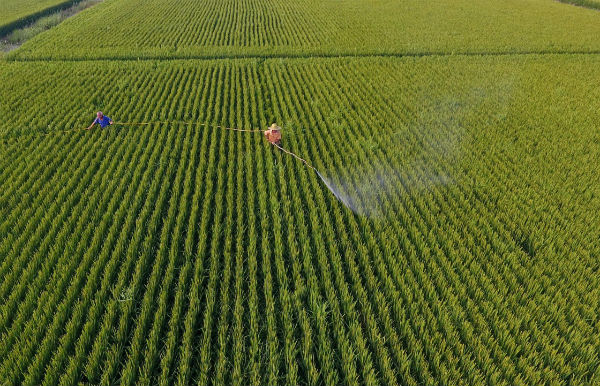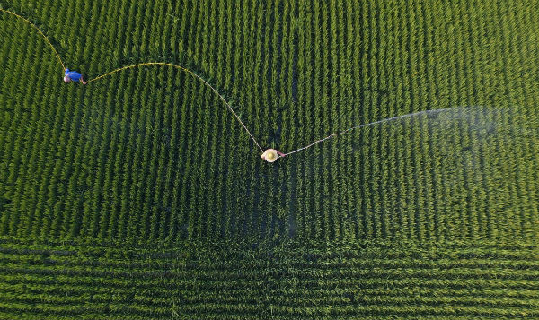 8月21日,唐山市海港开发区王滩镇农民在喷洒农药,防治病虫害