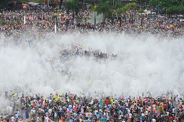 4月15日,人们在云南景洪市泼水广场上泼水狂欢。