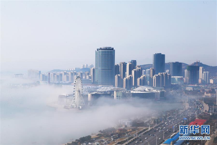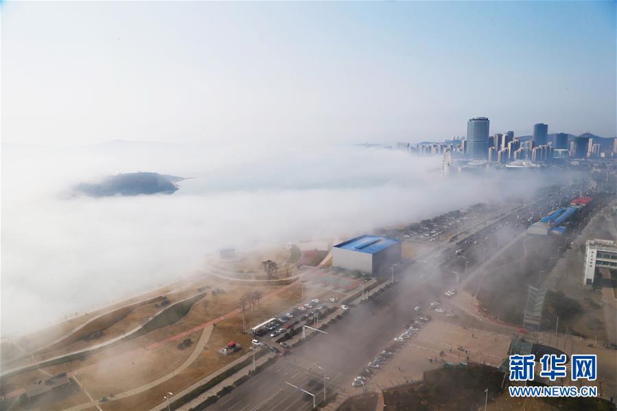 3月19日,山东青岛西海岸新区唐岛湾滨海出现平流雾,岛屿、建筑、街道在雾中若隐若现,宛若仙境。 新华社发(刘积舜 摄)