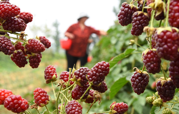 6月20日,山东省沂源县石桥镇黄墩河村的农民在采摘树莓。