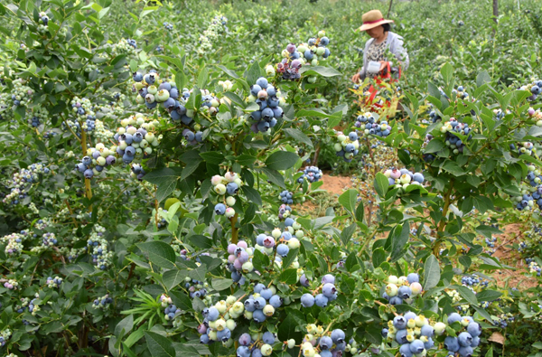 6月20日,山东省沂源县石桥镇毫山村的农民在采摘蓝莓。 近日,山东省沂源县农民种植的千亩蓝莓、树莓进入成熟期,当地农民加紧采摘,供应各地市场。近年来,山东省沂源县农民积极引进蓝莓、树莓等莓果种植生产,特色种植为农户带来高收益。 新华社发(赵东山 摄) |