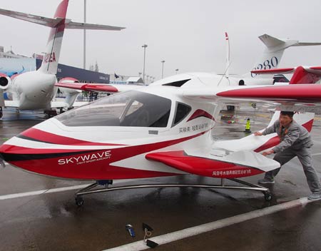 4月10日,工作人员在航空展会现场布置参展飞机。