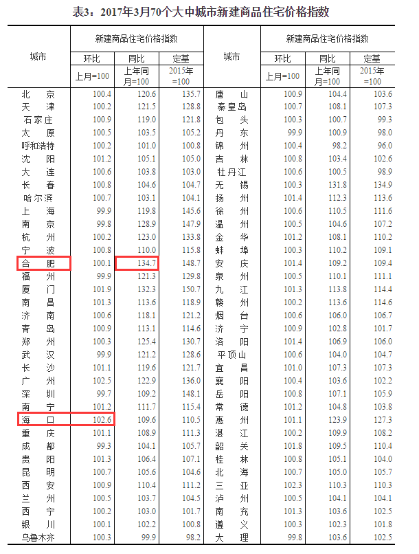 中国证券网讯 记者18日从国家统计局获悉,统计局公布2017年3月份70个大中城市住宅销售价格变动情况,数据显示,环比方面海口房价涨幅居首,其次为广州、三亚,同比方面合肥涨幅居首,其次为厦门、无锡。