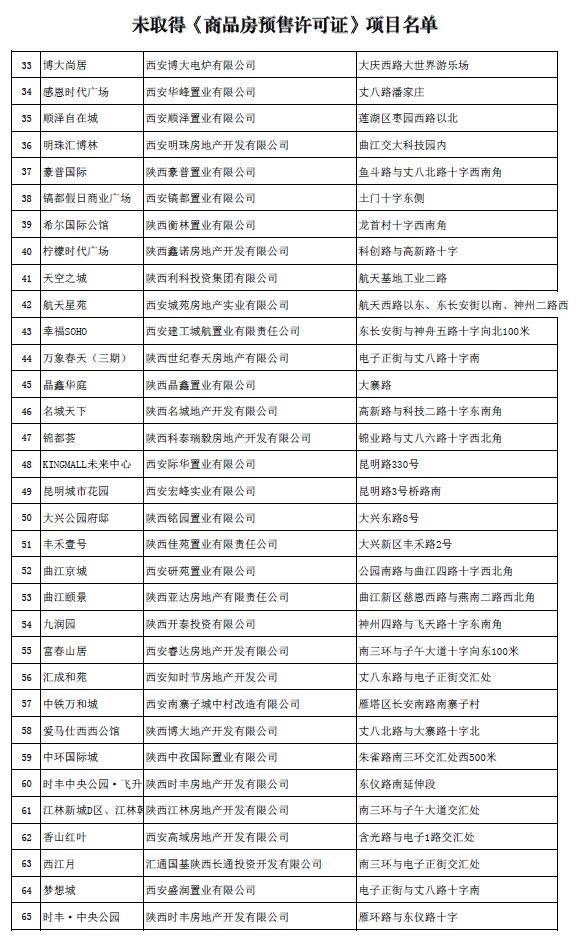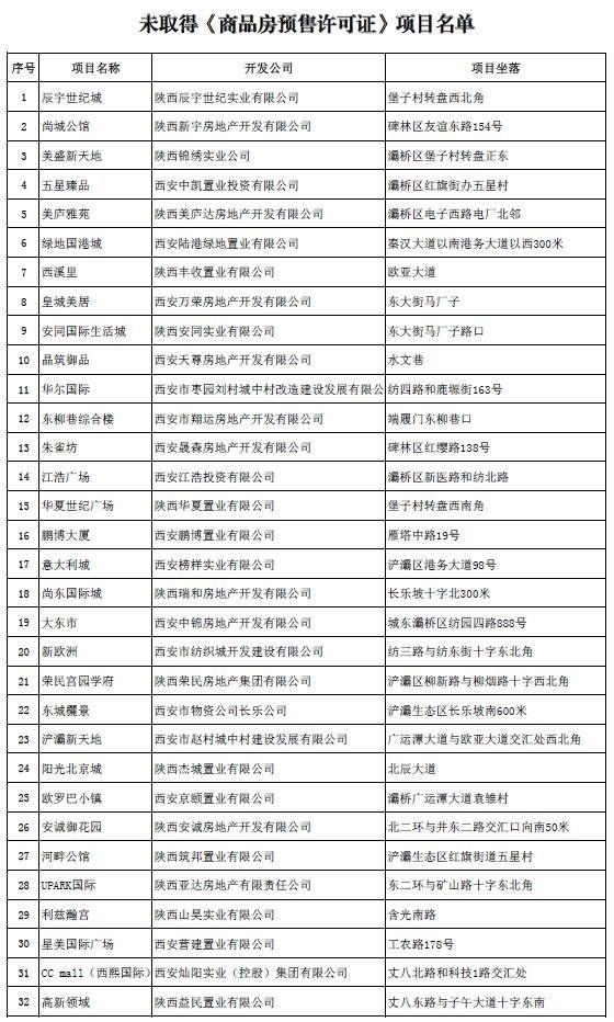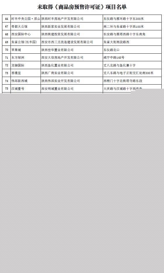 4月24日西安电视台《每日聚焦》曝光项目梨园公馆 大事件二:2017-04-25 16:03 公告:暂停世联合富及创典等代理公司房地产销售活动 关于暂停房地产代理销售公司房地产销售活动的公告 “万科东方传奇”、“万科城市之光”项目涉嫌无证销售,已被“每日聚焦”节目曝光,西安世联投资咨询有限公司、陕西合富辉煌房地产顾问有限公司、西安创典全程地产顾问股份有限公司涉嫌违规代理销售上述未取得《商品房预售许可证》的项目,现暂停其在我市的一切房地产销售活动。我局将依法对其进行严肃查处。 特此公告。 西安市住房保障和房屋管理局 二〇一七年四月二十四日 大事件三:2017-04-25 18:26西安房管局公布首批128个未取得预售证楼盘 4月25日,西安市房管局公布全部及部分楼幢未取得《商品房预售许可证》的房地产开发项目名单(第一批),涉及西安128个项目。具体内容如下: 全部及部分楼幢未取得《商品房预售许可证》的房地产开发项目名单为规范房地产市场秩序,保护广大市民合法权益,现将我局日常检查中发现的第一批全部或部分楼幢未取得《商品房预售许可证》的房地产开发项目名单予以公布,并通知如下: 一、本次公布的房地产开发项目,在未取得《商品房预售许可证》之前,不得对外销售,或以采取发放VIP卡、内部认购、缴纳诚意金等形式变相预售。同时,要求以上项目的开发企业,尽快到土地、规划、建设、城改等部门办理相关手续。如发现存在无证售房等违法销售行为,我局将对其进行严肃查处,一律顶格处理。 二、提醒广大市民在购房前,要求开发商出示《商品房预售许可证》,查看《商品房预售许可证》载明的楼幢号,切勿购买未取得《商品房预售许可证》的房屋。